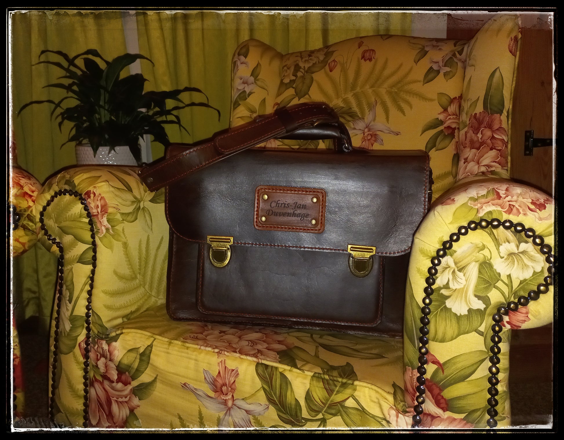 420x300x150mm. 2 compartments, a flat zip pocket, loops for pens. The whole bag is fully padded. Built to last a lifetime! Colours can be personalised.