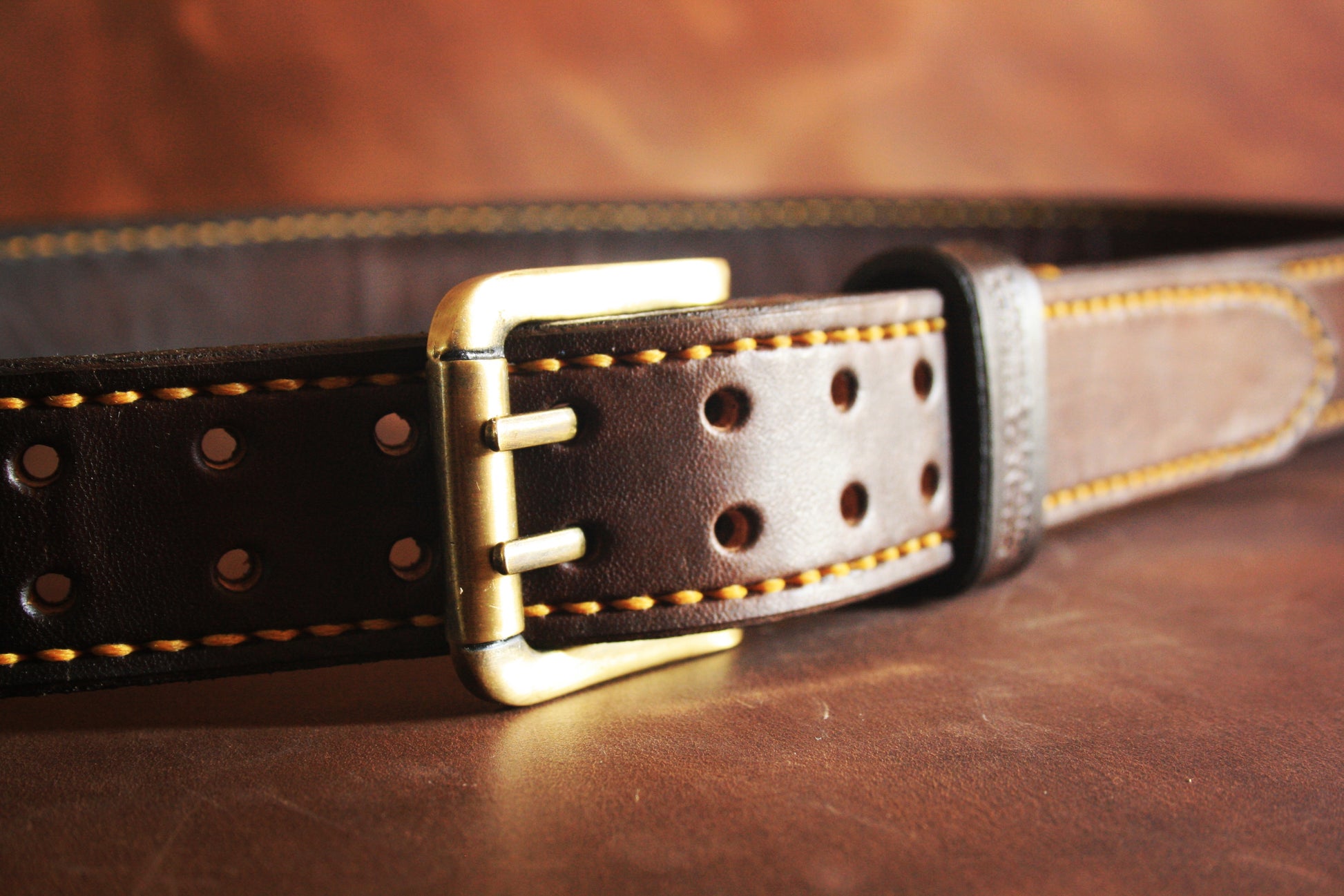Custom made belt. Heavy duty double prong buckle. Double layered leather.
