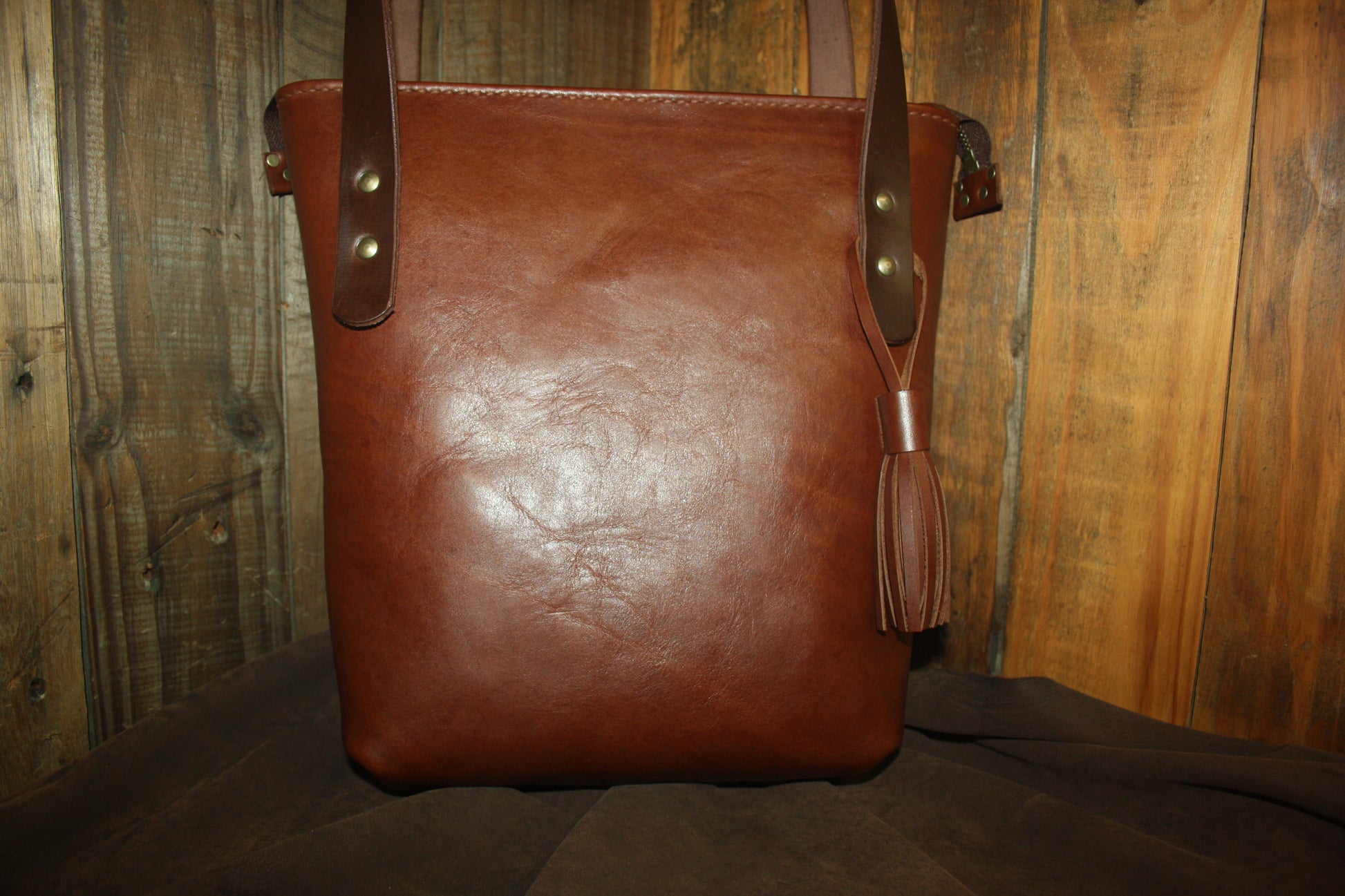 Zip closure at the top, flat open pocket on the inside, veg tan slings and a tassel.